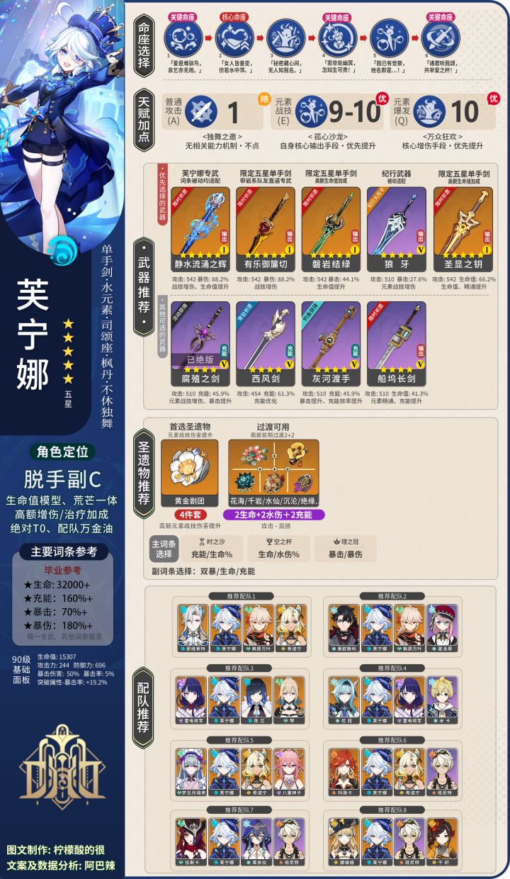 一张图带你搞定芙宁娜的圣遗物、武器、配队、天赋加点、参考面板、命座选择等一系列问题~