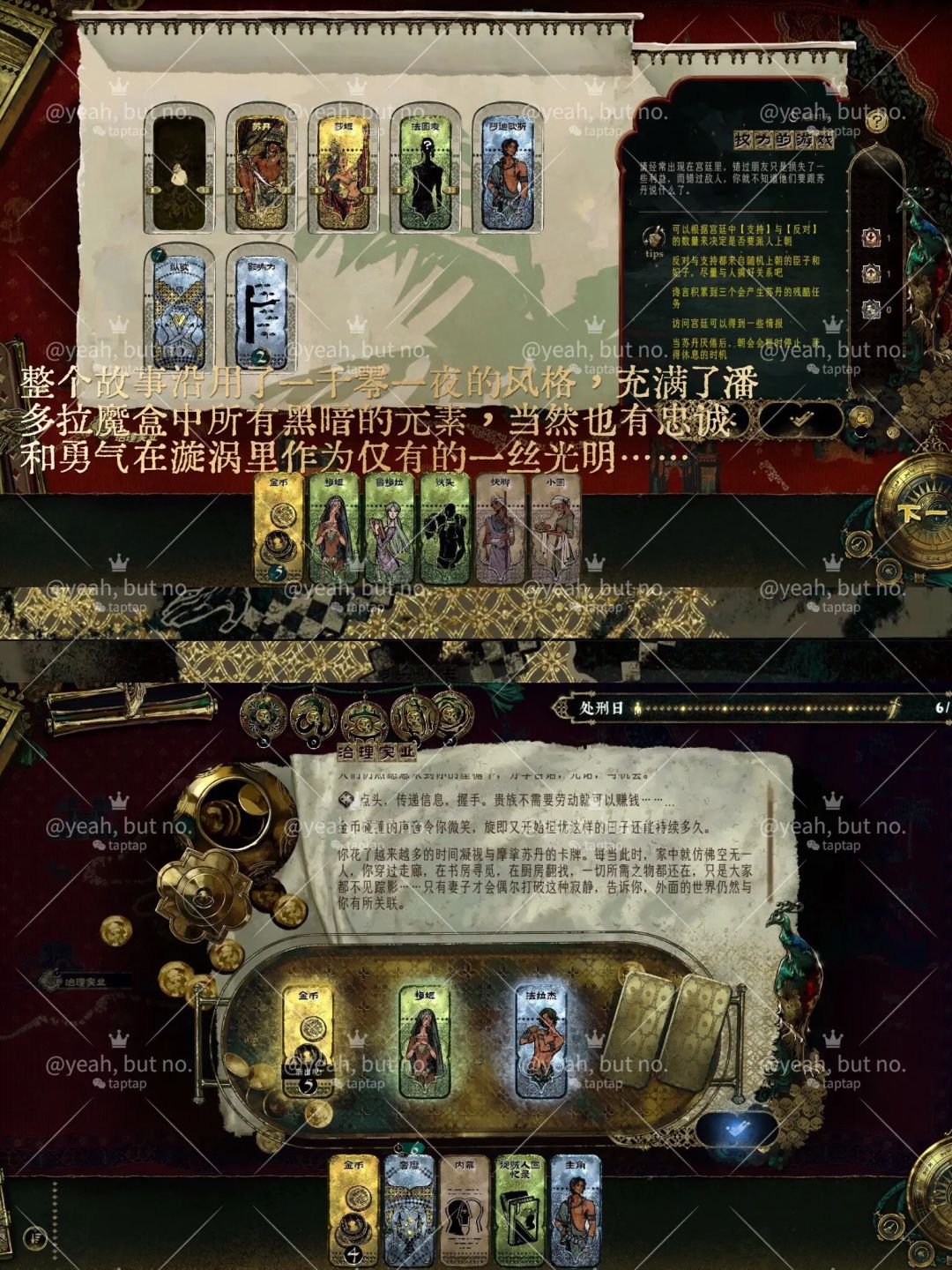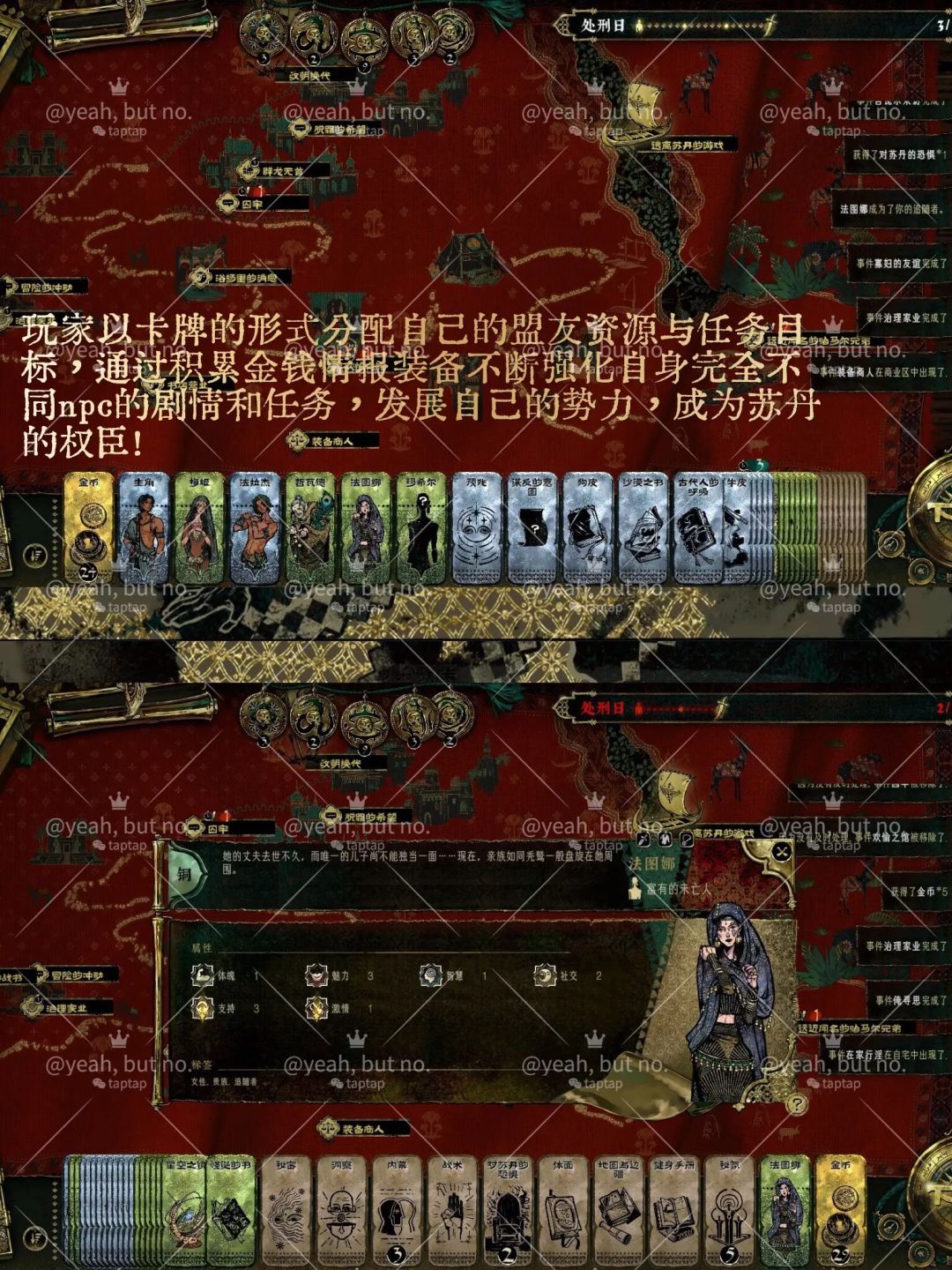 ✔️作为回合制的资源管理游戏,玩家以卡牌的形式分配自己的盟友,资源与任务目标。积累金钱、情报、装备、强化自身,完成不同NPC的剧情任务,并将其招募为盟友,发展自己的势力,成为苏丹宫廷的权臣。但是每一张苏丹卡都要花费极大的代价,可这也是这个游戏世界观中,最悖逆的存在——肆无忌惮的,不计后果的奖赏。