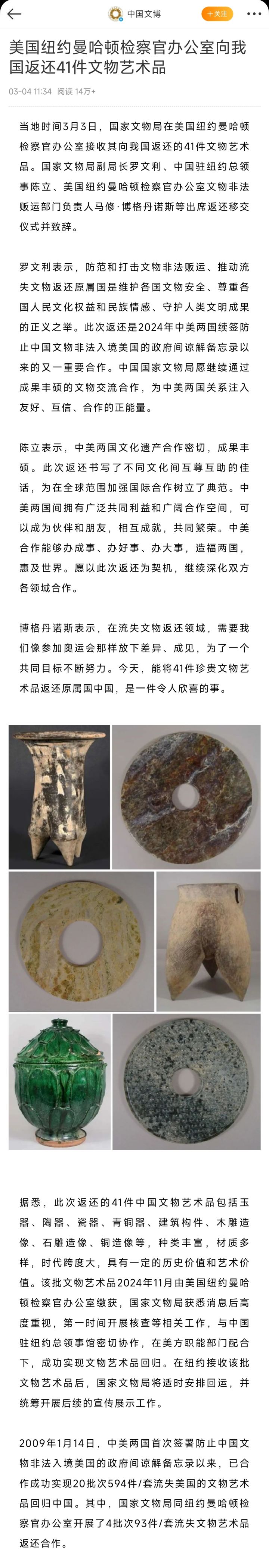 当地时间3月3日,国家文物局在美国纽约曼哈顿检察官办公室接收其向我国返还的41件文物艺术品。