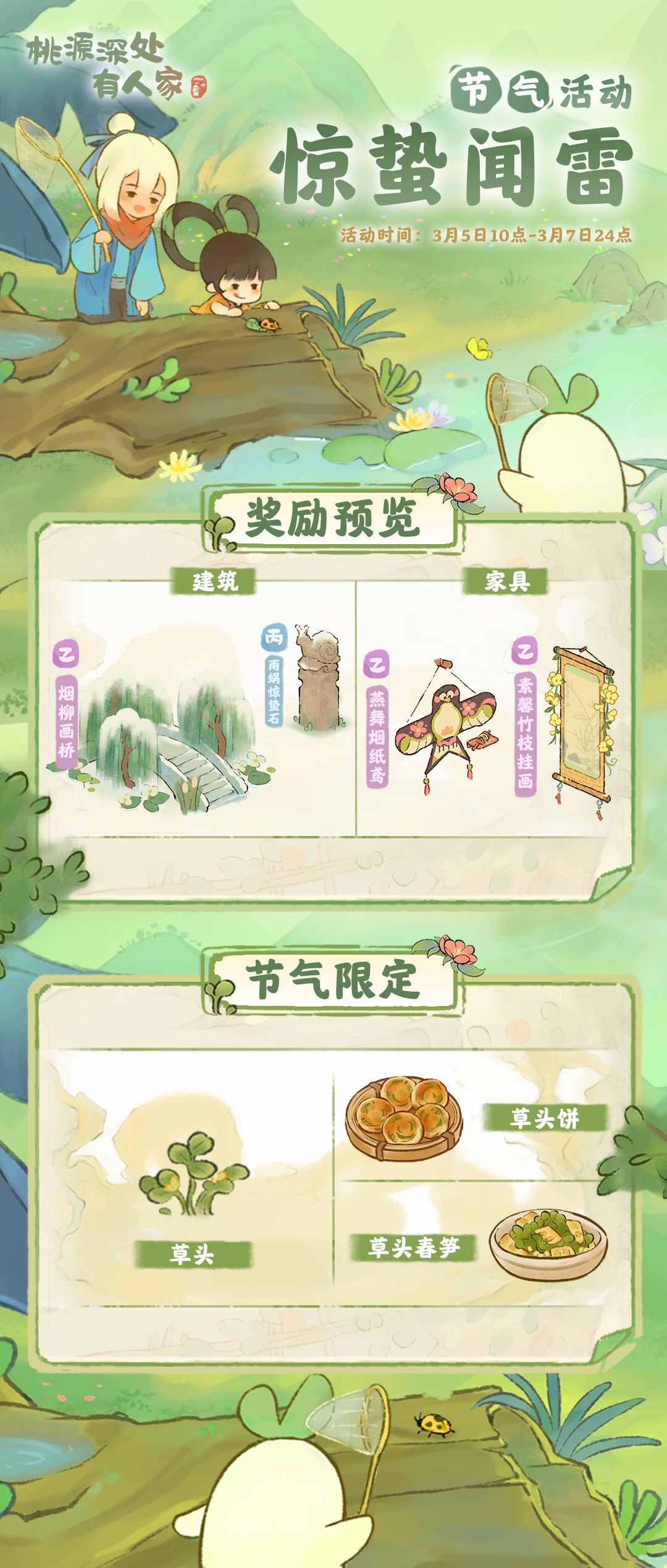 活动期间山民可以种植节气农作物「草头」,用来制作美味的节气菜品「草头饼」和「草头春笋」,听起来就很清新呢!小萝卜已准备好了本期的节气限定建筑和限定家具,山民记得参与活动获取玥琅,不要错过兑换时间萝!阳气初惊蛰,韶光大地周。萝萝山春意渐浓,一切美好都在悄然发生!