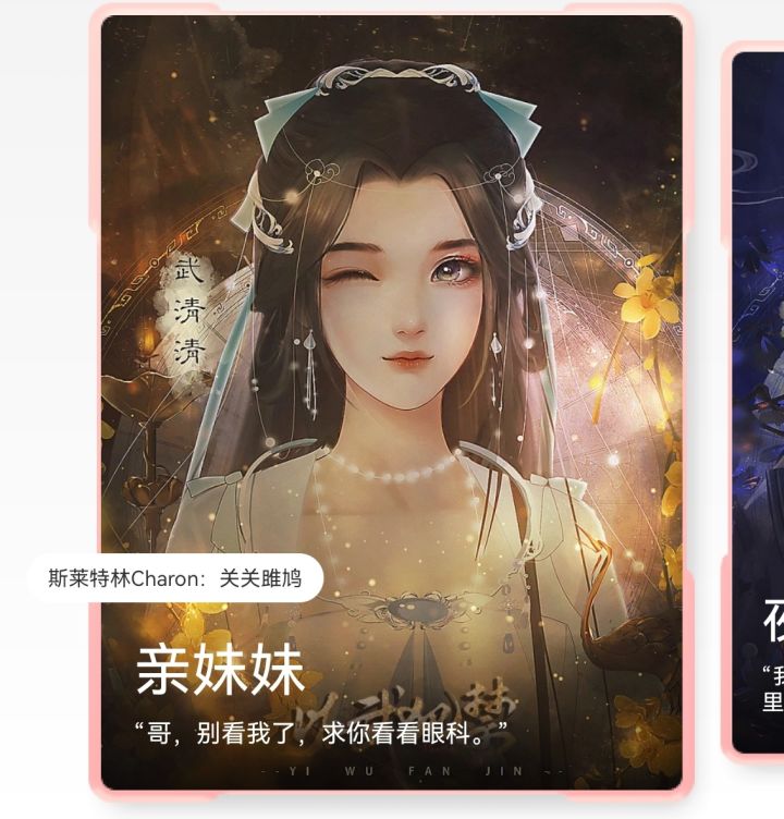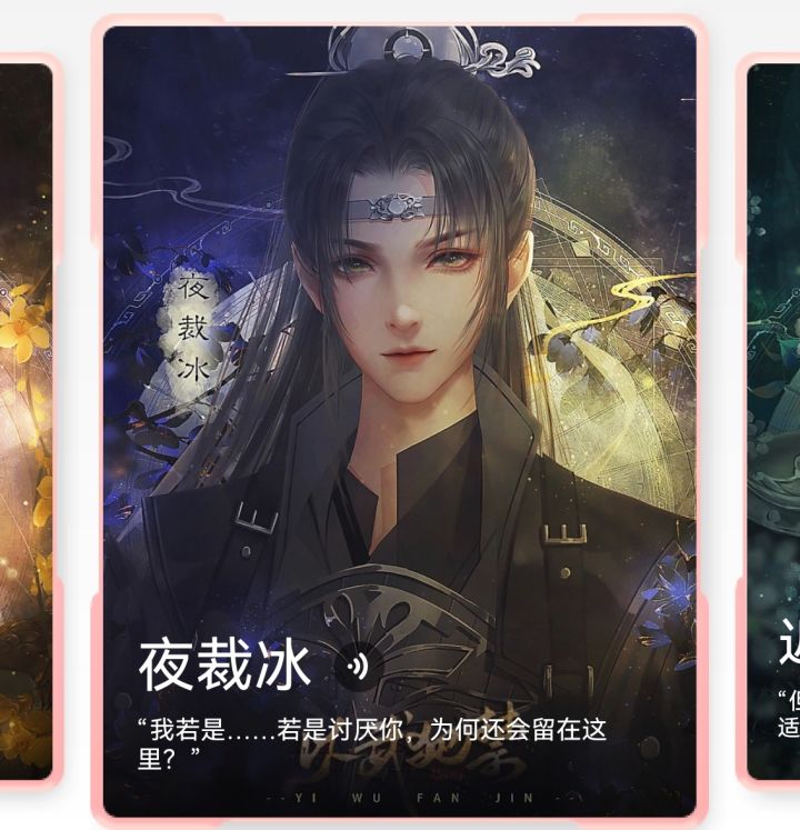 - 夜裁冰:你的便宜徒弟,对你一直念念不忘。他在共通线中能激化雄竞,为故事增添了不少趣味,而他的专线剧情更是质量高于预期,带你体验一段别样的师徒情谊。