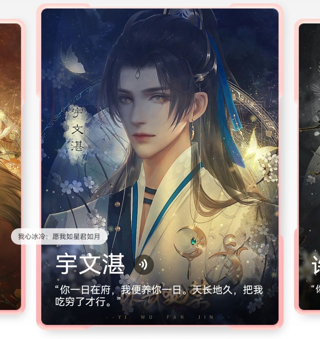 - 宇文湛:惠王府世子,如戏精边牧般的存在,调皮又爱开玩笑,老是逗你玩。他承诺,只要你一日在府中,便保你和妹妹衣食无忧,他的热情与不羁,能否打动你的心?