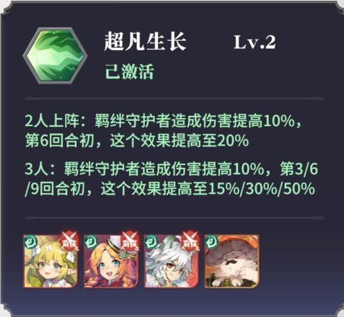 除此之外,成长队还能获得“闪耀之力”的羁绊效果——超凡生长守护者伤害增加10%,三回合后提升至15%,六回合后提升至30%,九回合后提升至50%。