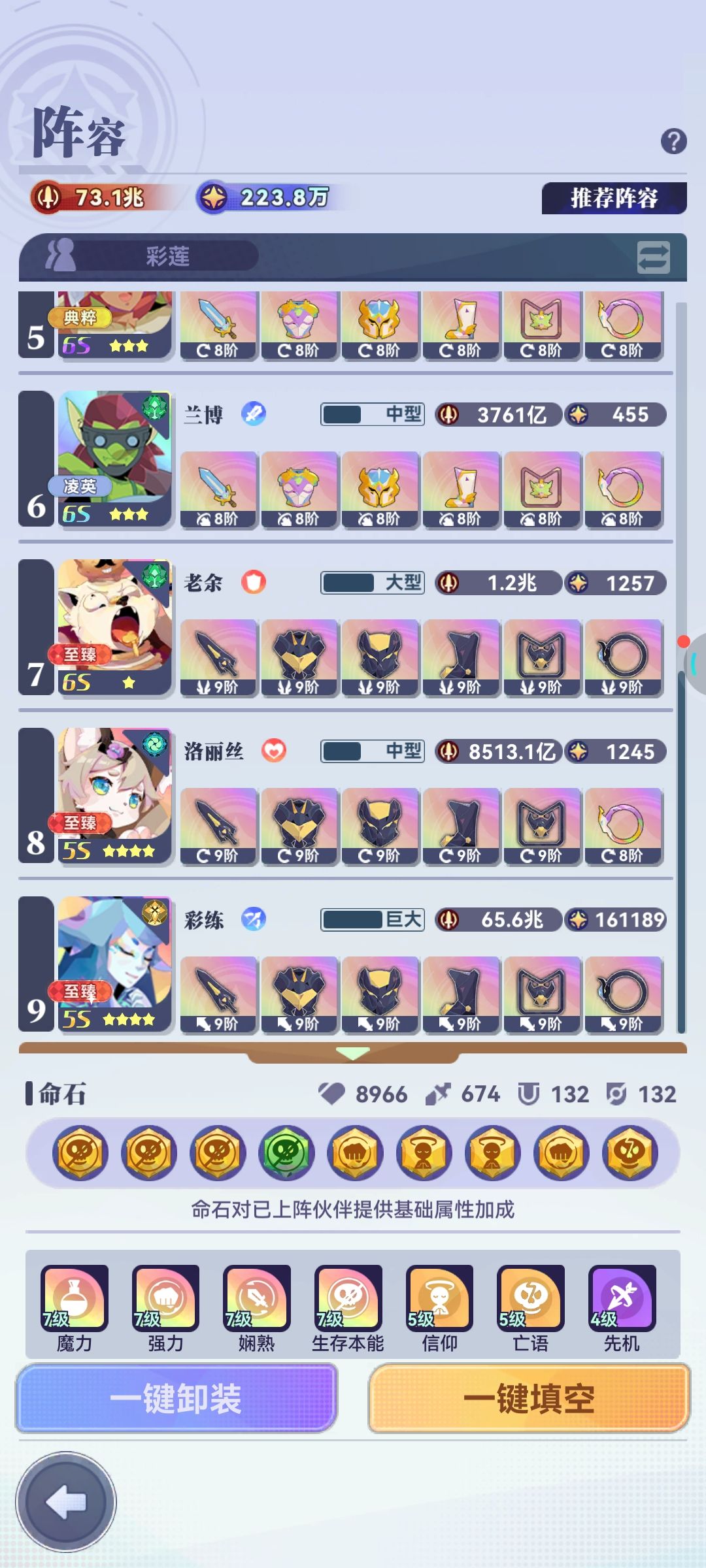 彩莲配置:6-1两格,不带敏捷84.6兆,通关时带了五级敏捷石头战力107.4兆,神盾套