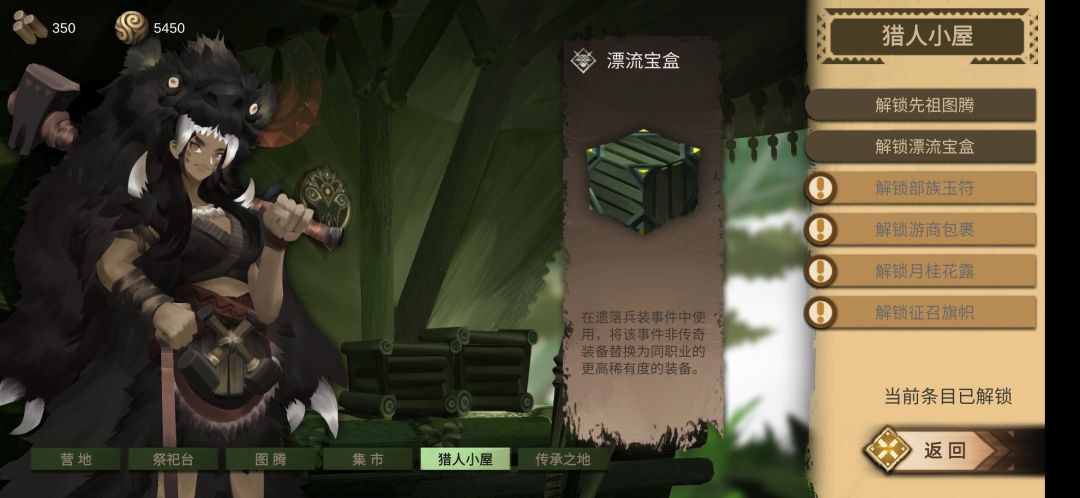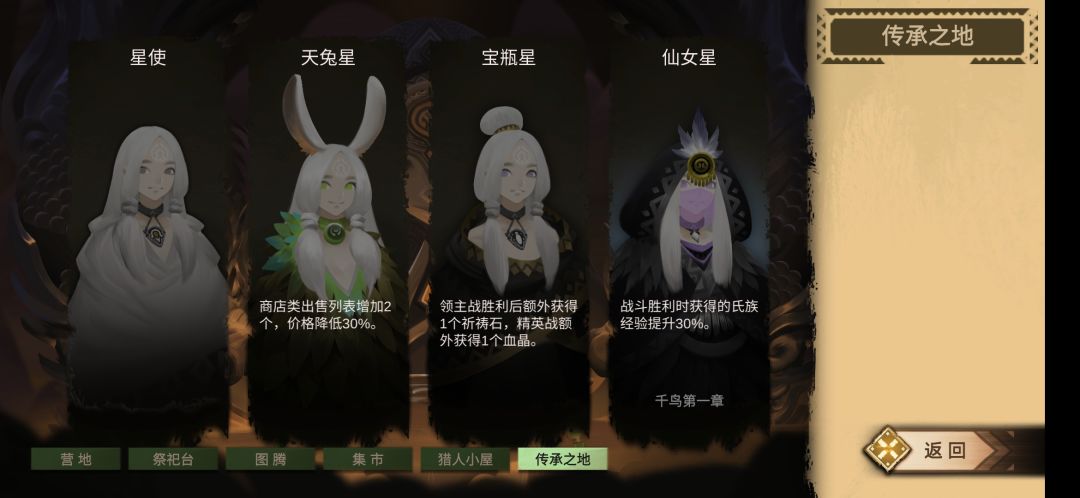 图①点首页的营地进去后,底下有“营地”,“献祭台”,“图腾”,“集市”,“猎人小屋”,“传承之地”,六个选项。