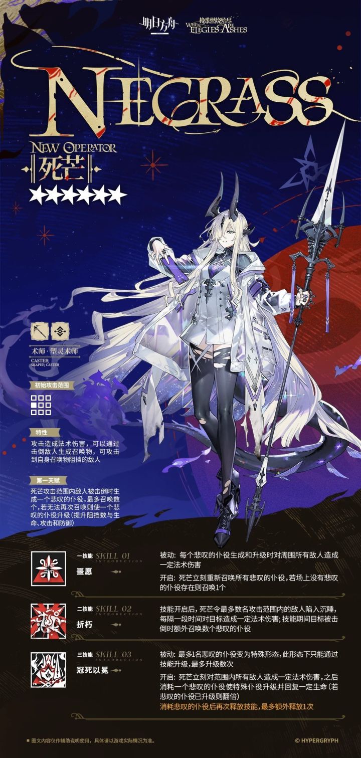一技能“噩愿”兼具被动与主动效果,被动是仆役生成、升级时对周围敌人造成法术伤害,主动能即时重召仆役。二技能“折朽”可令多名敌人沉睡,期间击倒目标还能额外召仆役,持续输出与控制拉满。再配上影法师绘制的超炫立绘,“死芒”这位新干员已赚足眼球!