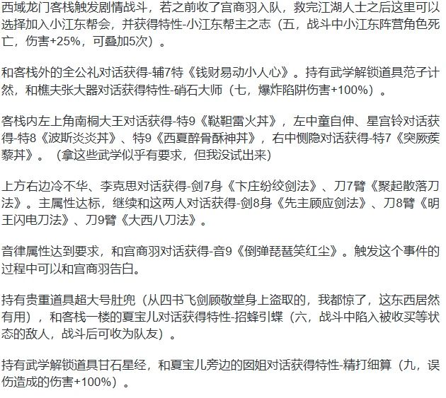 3.若持有太湖水道怪图,调查宫衍行身边闪光点,主角与宫莫言获得特性-潇湘夜雨式(七,战斗中每多打出一次攻击,下一目标受伤+5%)。