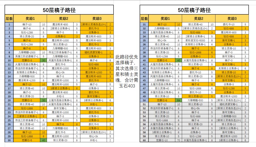 原方法不变,依旧是拿最便宜的奖励;变动为第十层、第二十层觉醒石不拿,选择最便宜的奖励,合计需404玉石上60层。