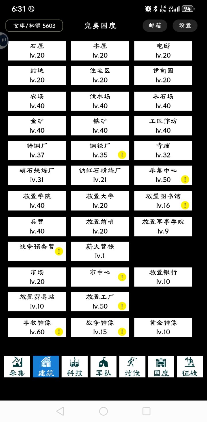 资源建筑模块:前期多注重金-粮-木-石-研究点以及工具,(小提示:每种资源人口超过10会减效率)尽量根据科技以及基建建筑需求合理分配,达到最大化收益。建筑尽量卡11-21-31等级,因为会增加2点的资源产量。一般来说金粮工具可以优先40级,木头石头31即可,其他11-21或者31,根据资源消耗和库存进行一个分配吧。