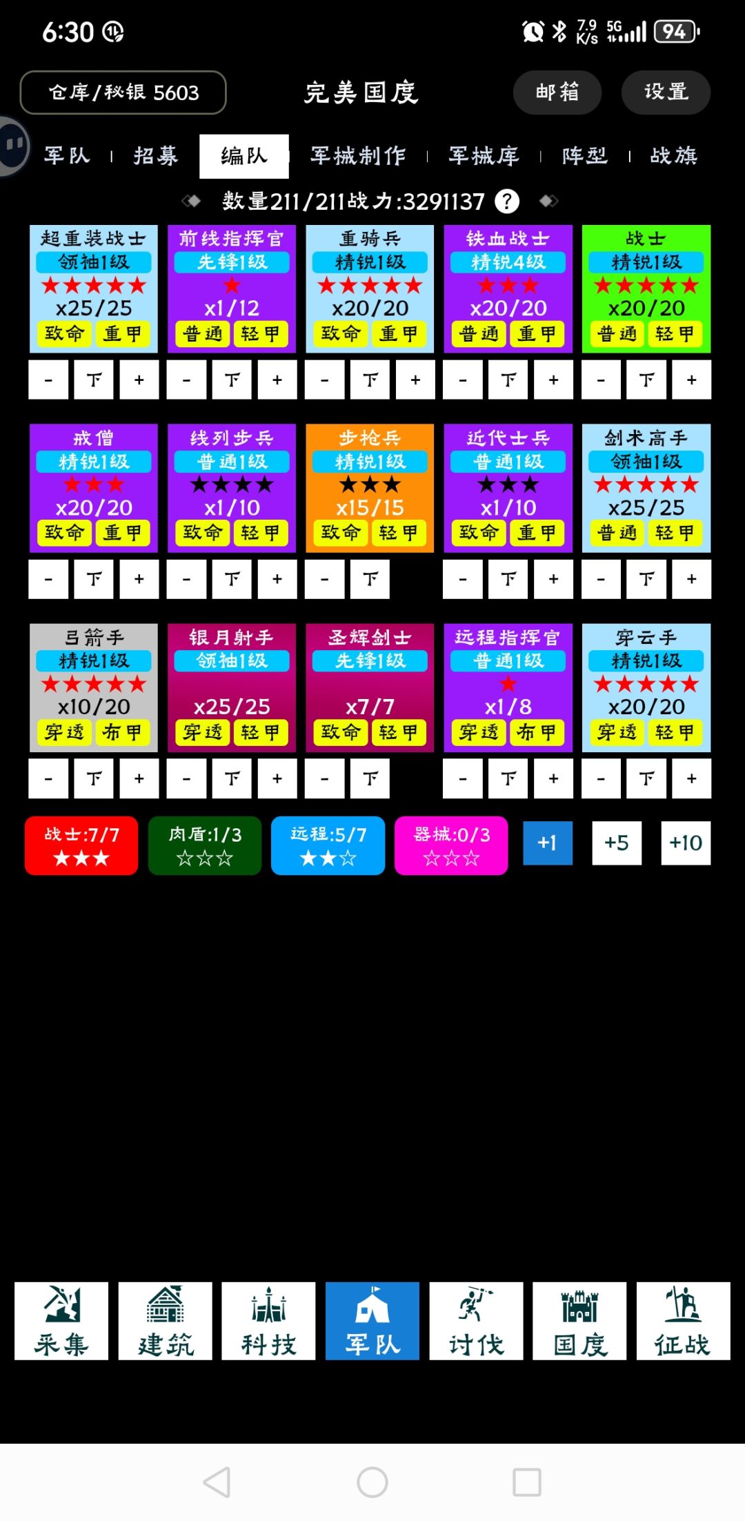 兵种战力:根据目前版本来说国兵“银月”算是版本之子(同时攻击二个目标造成百分百的伤害),但是不氪金不建议前三个月使用银月,因为圣物星光阵旗等因素银月属性偏低战斗站不住,开局初级兵营购买白弓绿战士和绿重装战士即可,基建一定程度培训到先锋去打讨伐即可。目前主流版本还是战士+远程,不过近期更新有趋势在加强肉盾了。大概一个星期左右能出中级兵营,所以不要心急。中级兵营购买蓝色超重-剑术高手-穿云手-重骑(火绳枪兵)前三个必买,后面二个不急可以考虑第二个月左右买紫兵,只是会节奏稍微慢点,好处是节省资源。到这个阶段基本就看个人喜好了,也对游戏有一定理解和思路了。军功令是关键,千万别用来刷新兵营等等,最好是留着开中级兵和高级兵营。军功获取最多的目前就征战和讨伐,所以这个游戏也有基建党和升兵力讨伐党之分,侧重点不同罢了,基建党资源后期会多点,军功会少点,尽量找到这个平衡点即可。对这类型感兴趣的可以入坑一试吧,这个游戏周期比较久,所以也适合一部分玩家来作为副游或者尝鲜