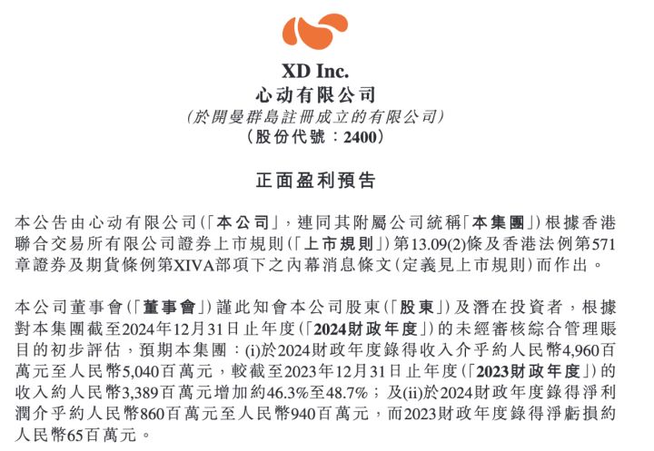 昨日晚间,心动公司披露2024年正面盈利公告,预计该集团2024财年收入49.6亿元至50.4亿元(人民币,下同),同比增长46.3%至48.7%。净利润为8.6亿元至9.4亿元,同比扭亏为盈。2023财年,该公司净亏损约6500万元。