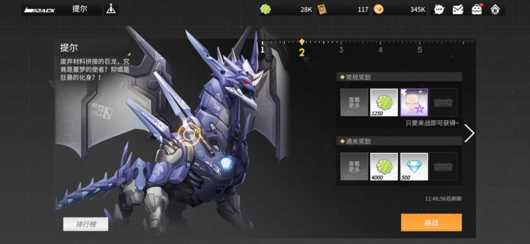 挑战大龙,主要奖励为钻石和四叶草贴纸,每次攻击消耗大龙的血量达到一定百分比,即可领取挑战奖励;每次攻击消耗大龙的所有血量,即视为通关,可以领取通关奖励。由于玩法属于福利性质,所以不会有战斗失败,即使我方手办角色全灭也未能击败大龙,也会按消耗大龙的血量占比来结算本次战斗的奖励。