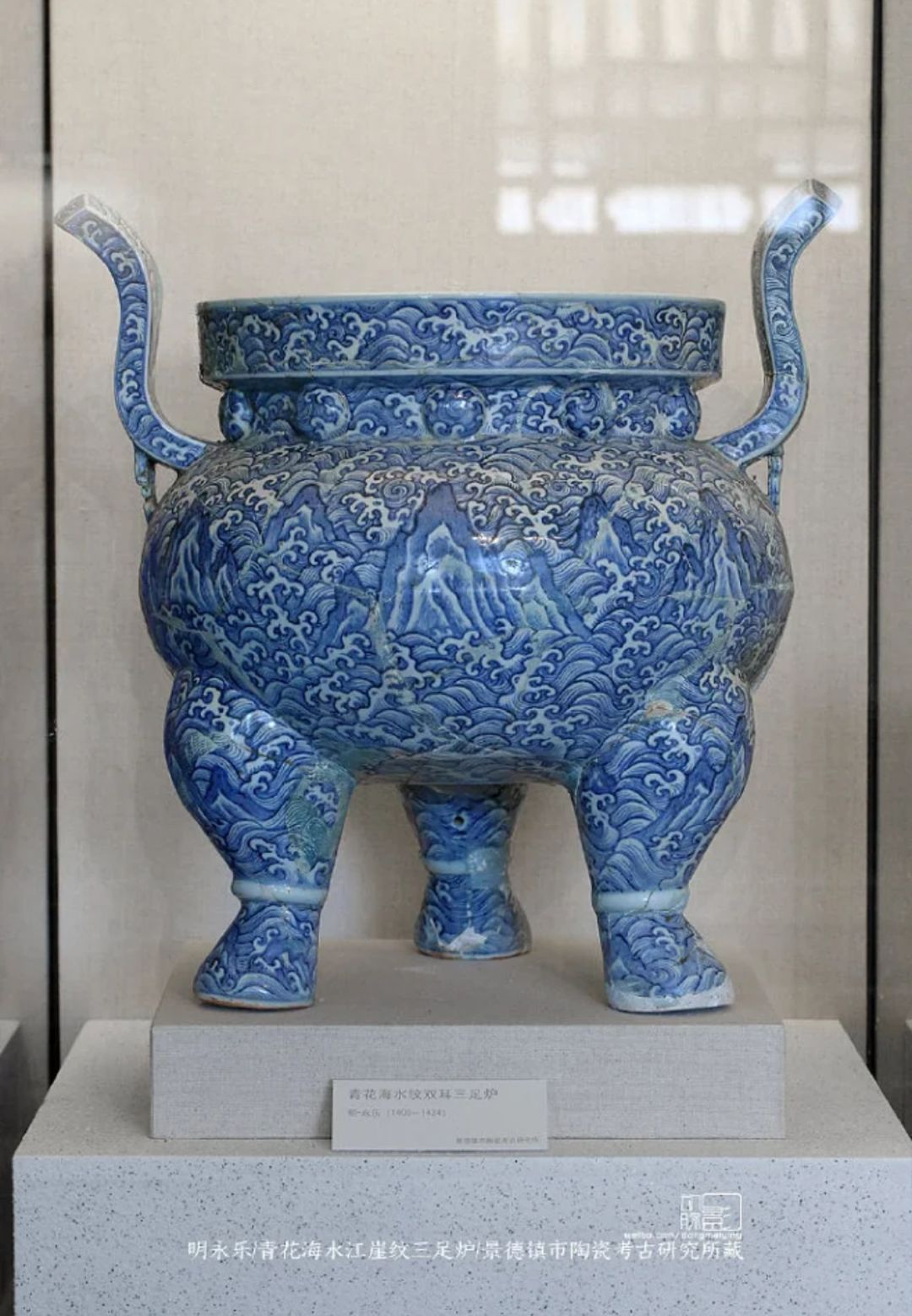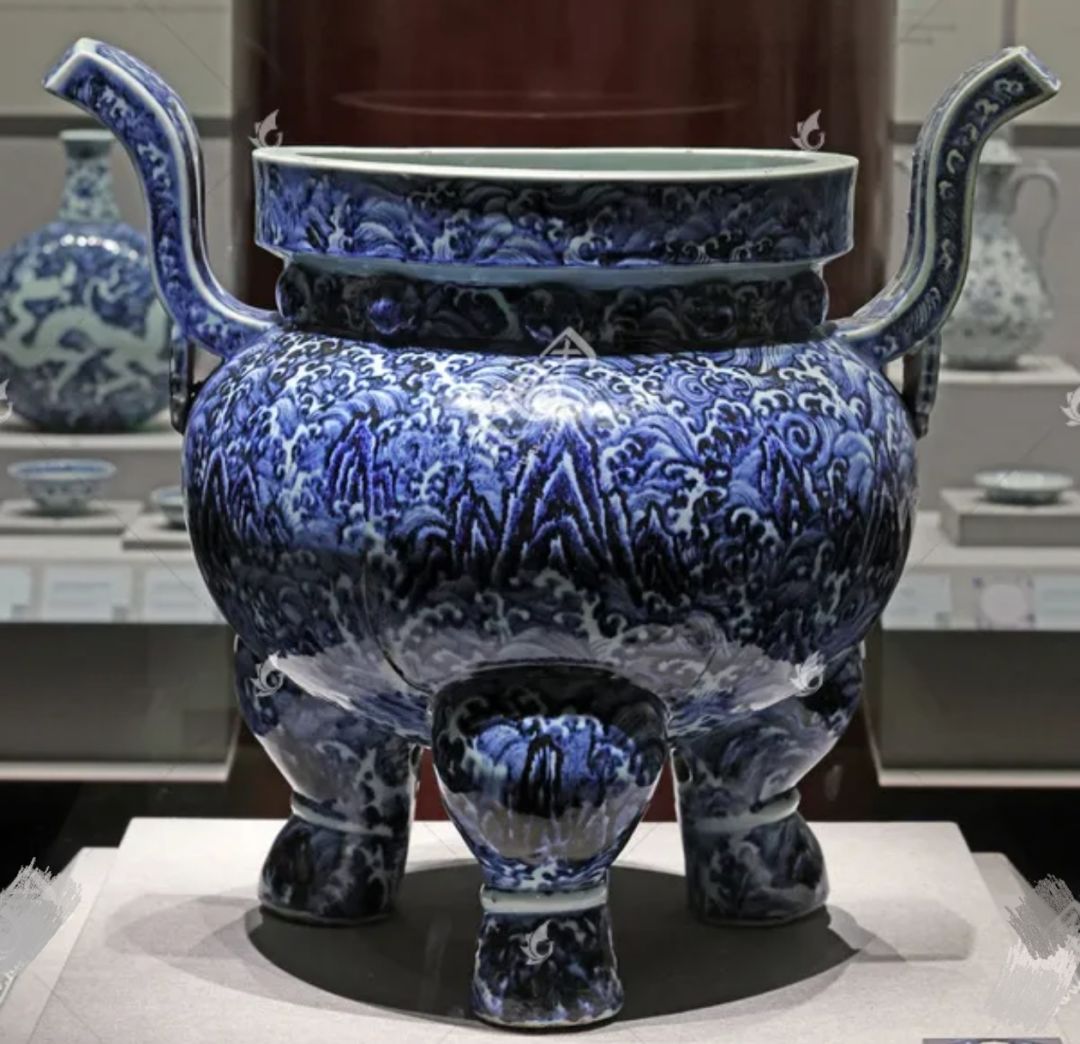 明青花海水江崖纹三足炉作为国宝级文物,曾在多个重要展览中展出,如与青海省博物馆藏铜鎏金圆腹三足炉、南京博物院藏青花寿山福海纹三足炉等一同展出,让观众领略永乐时期的辉煌遗产。#物华弥新创作者激励计划 #物华弥新海水江崖炉 #物华弥新