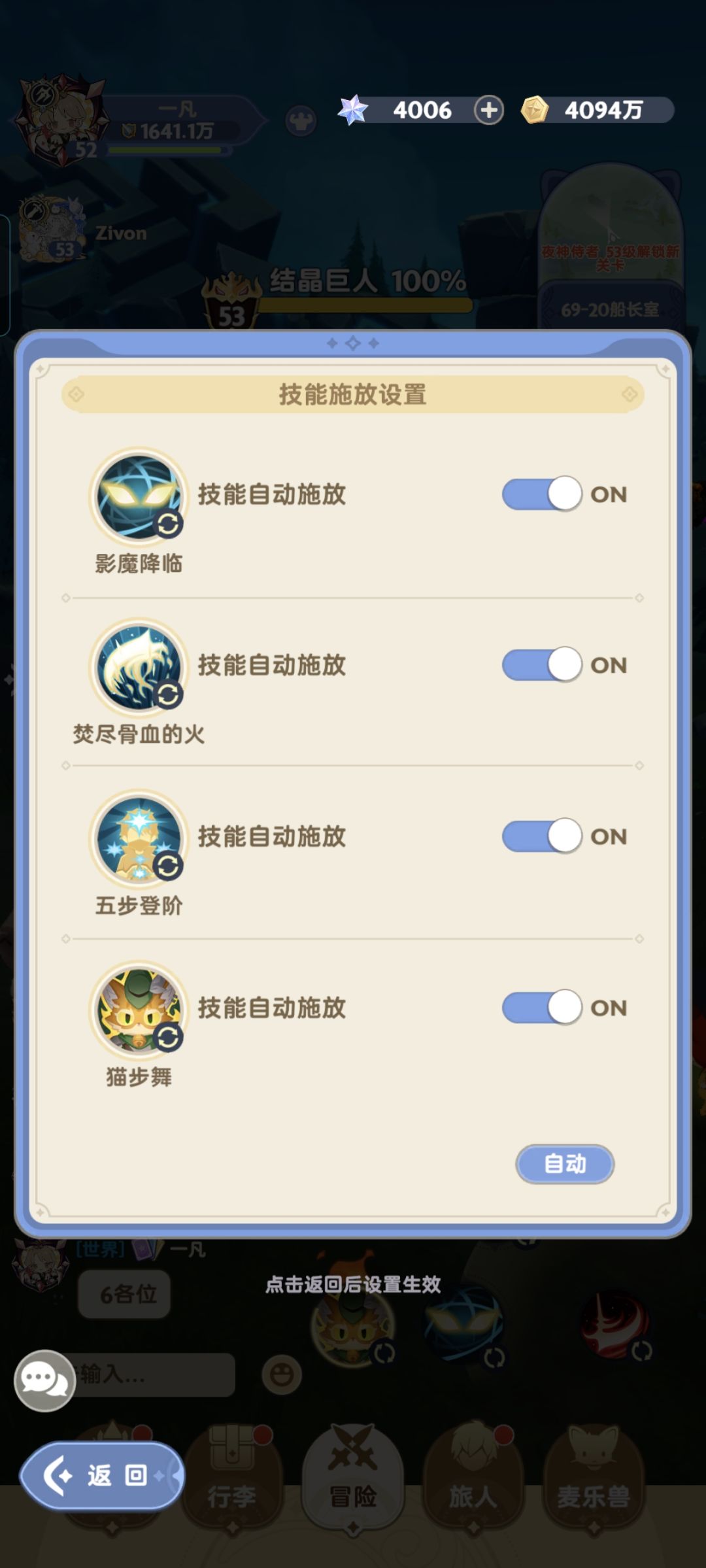 2,技能设置自动或者手动,进图以后长摁技能上方齿轮,会弹框,例:图4,图5页面。玩T只需要开盾设置手动,其他全自动即可。