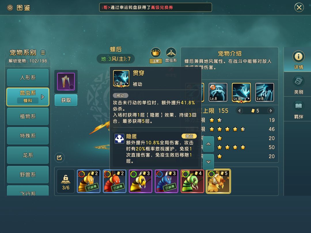 蜜蜂系:当下版本最热门物理宠,高端局必备特性高速被动自带高必杀加成觉醒隐匿有增伤可以抵消伤害且有20%概率无视援护,自身高闪技能有敏捷加成伤害高速度快生存好。