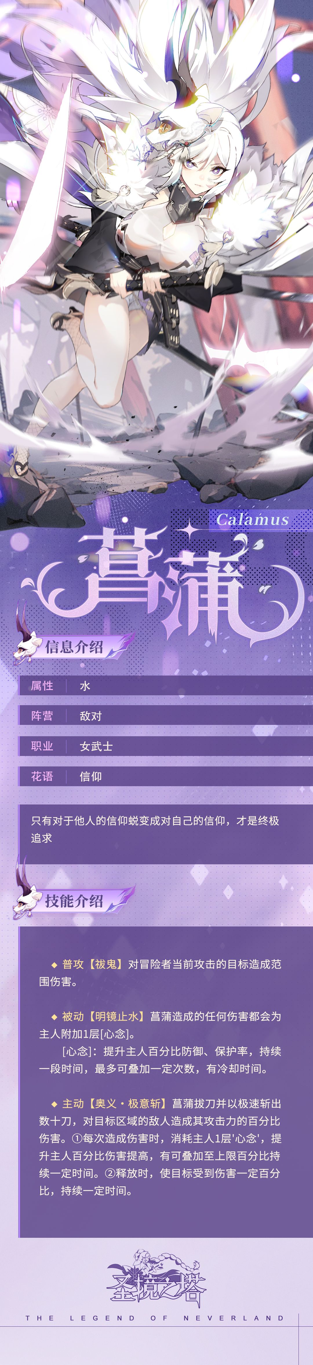 菖蒲不记得自己因何诞生,只记得极冷的雪夜里,她拖着“鬼切”和重伤之躯濒死昏迷前,老家主向她伸出了手,醒来、伤愈、流浪于山林的菖蒲为了报恩,选择向丰田家效忠~
