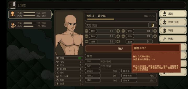 开局自选属性道德为1,庙里偷香火钱让道德变为0,然后在到城里继续做可以让道德减少的选项(实际上属性面板还是道德0,其实已经是负数了),一直减道德就行了,完了就可以去北边救这俩货色,完了就可以让这两个人加入。