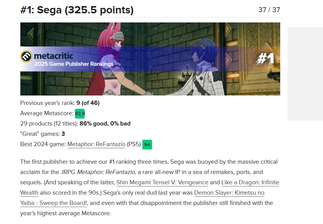 1) 世嘉(325.5分) – 82.9 (去年:第9名) 最佳游戏:《暗喻幻想:ReFantazio》 94分