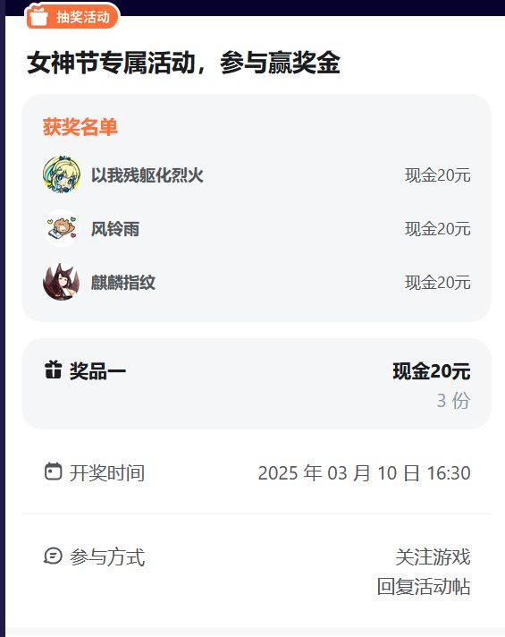 随机抽选3位修仙者:20元现金奖*1(随机抽取)