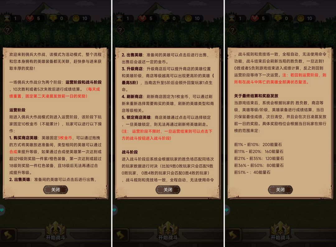 本场活动一共8天,每天8次机会参与作战,每次作战消耗2体力。作战分运营和战斗两个阶段,10场胜利或者5次失败后进行成绩结算。结算后会根据排行榜发放奖励(取每日最佳成绩最终发放奖励),每天0点重置成绩和次数,凌晨按次序发放前一日的奖励至邮件。具体规则详见下方截图。