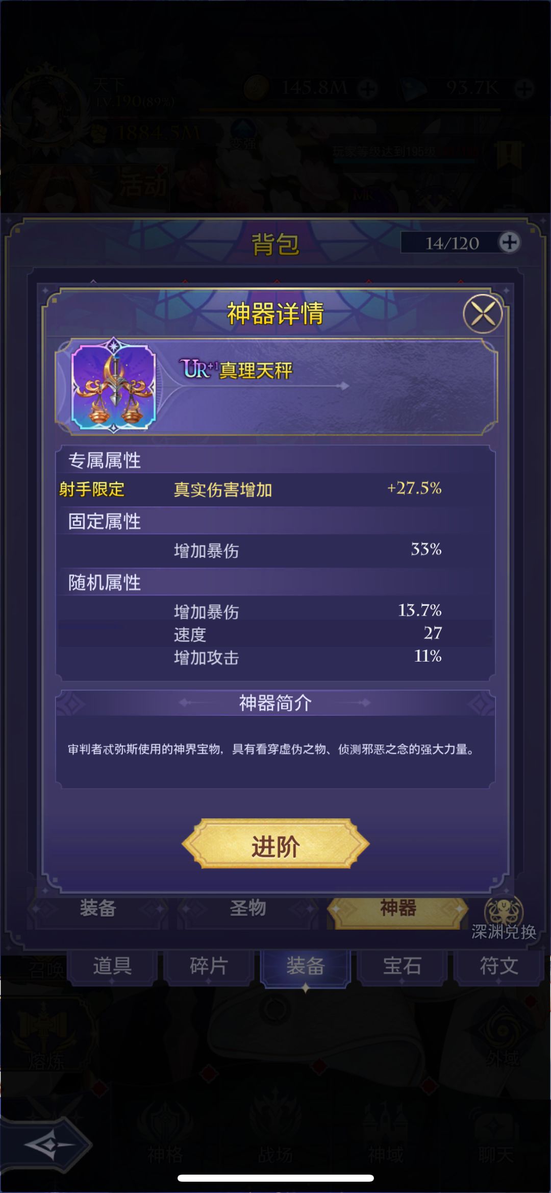 ·首先是路西法的养成,路西法需要注重爆伤属性,从神带卑弥呼,御灵可以不考虑套装优先选有暴伤的带,神器前期带真理天平,真理天平词条中最好有两个及以上的爆伤。