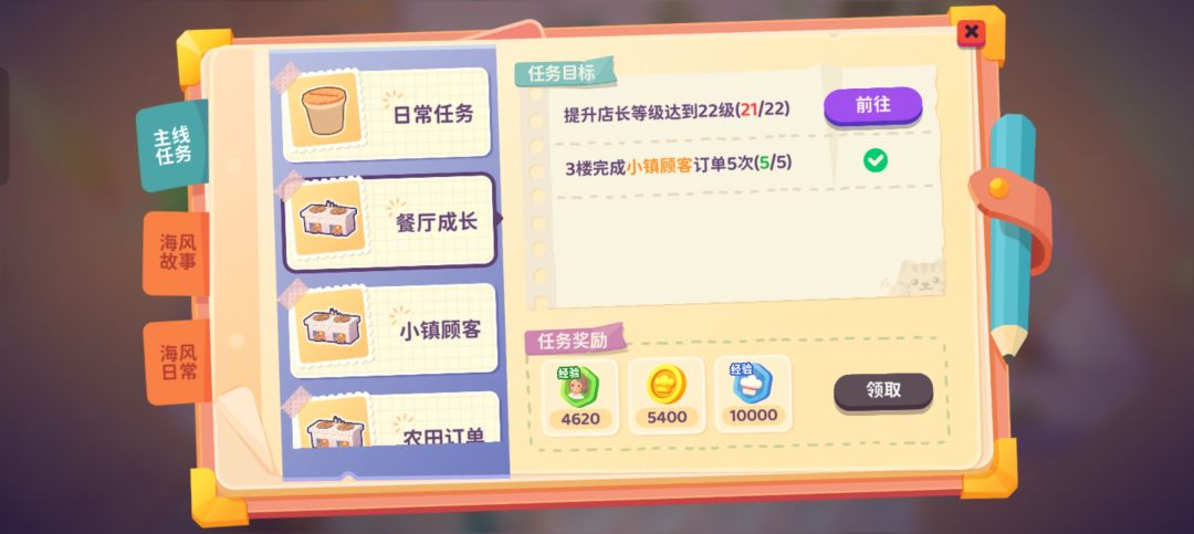 最重要 一定要看餐厅成长这个任务,给的经验非常的多。
