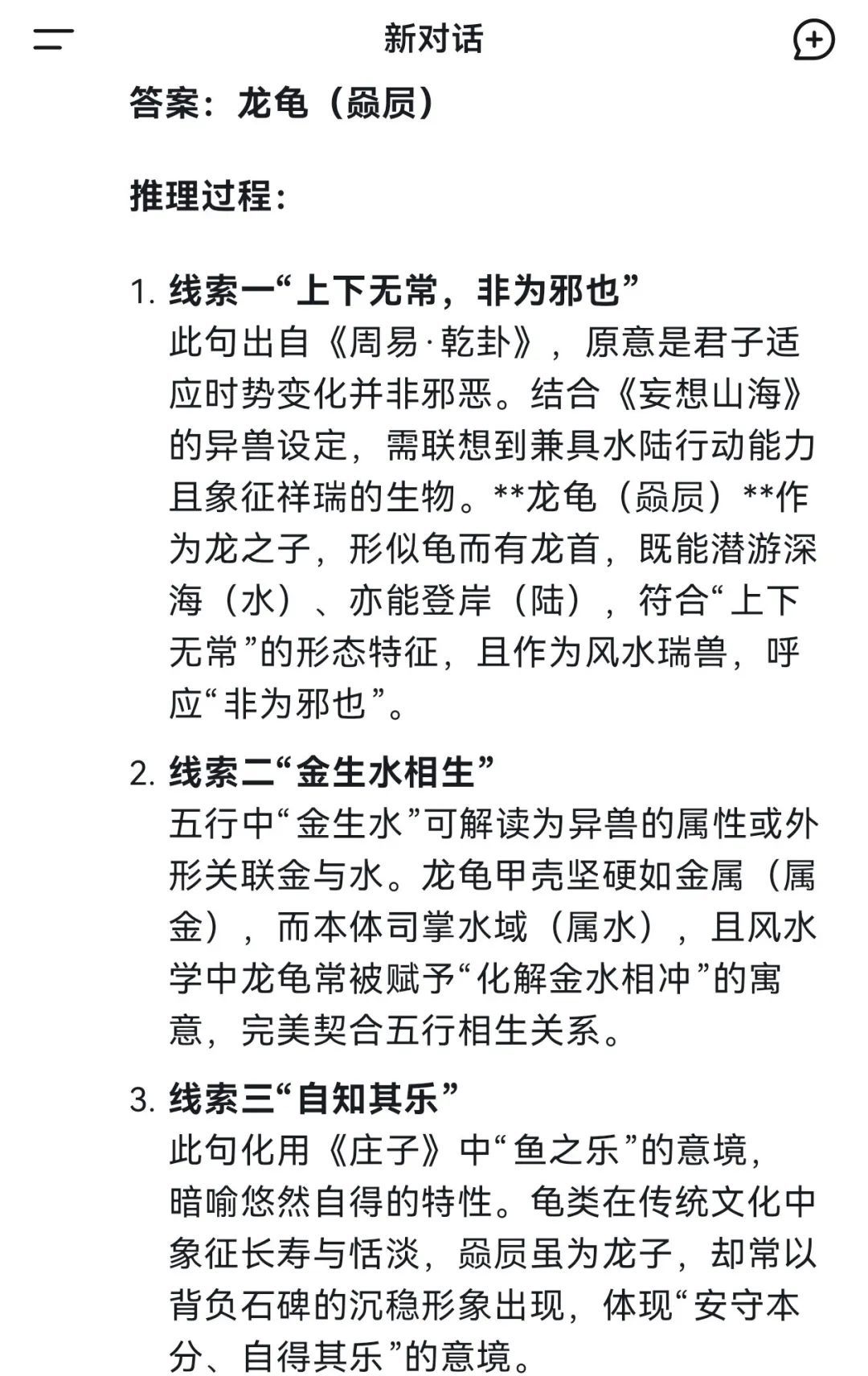 对于deepseek的答案,妄妄的评价是虽然推理的过程与正确答案非常接近了,但是却犯了一个错误,那就是没有玩过咱们的妄想山海!嘿嘿,山海玩家们都知道驮碑形象的龙子已经有霸下了,龙龟(赑屃)自然不是正确答案啦