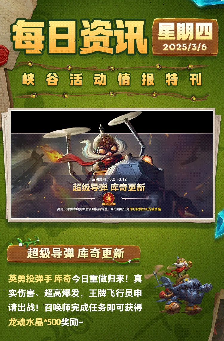 英勇投弹手 库奇更新后多项技能调整!真实伤害,超高爆发带来全新战斗体验!即日起,截止至3月12日23:59:59,召唤师完成活动任务即可获得龙魂水晶*500好礼~