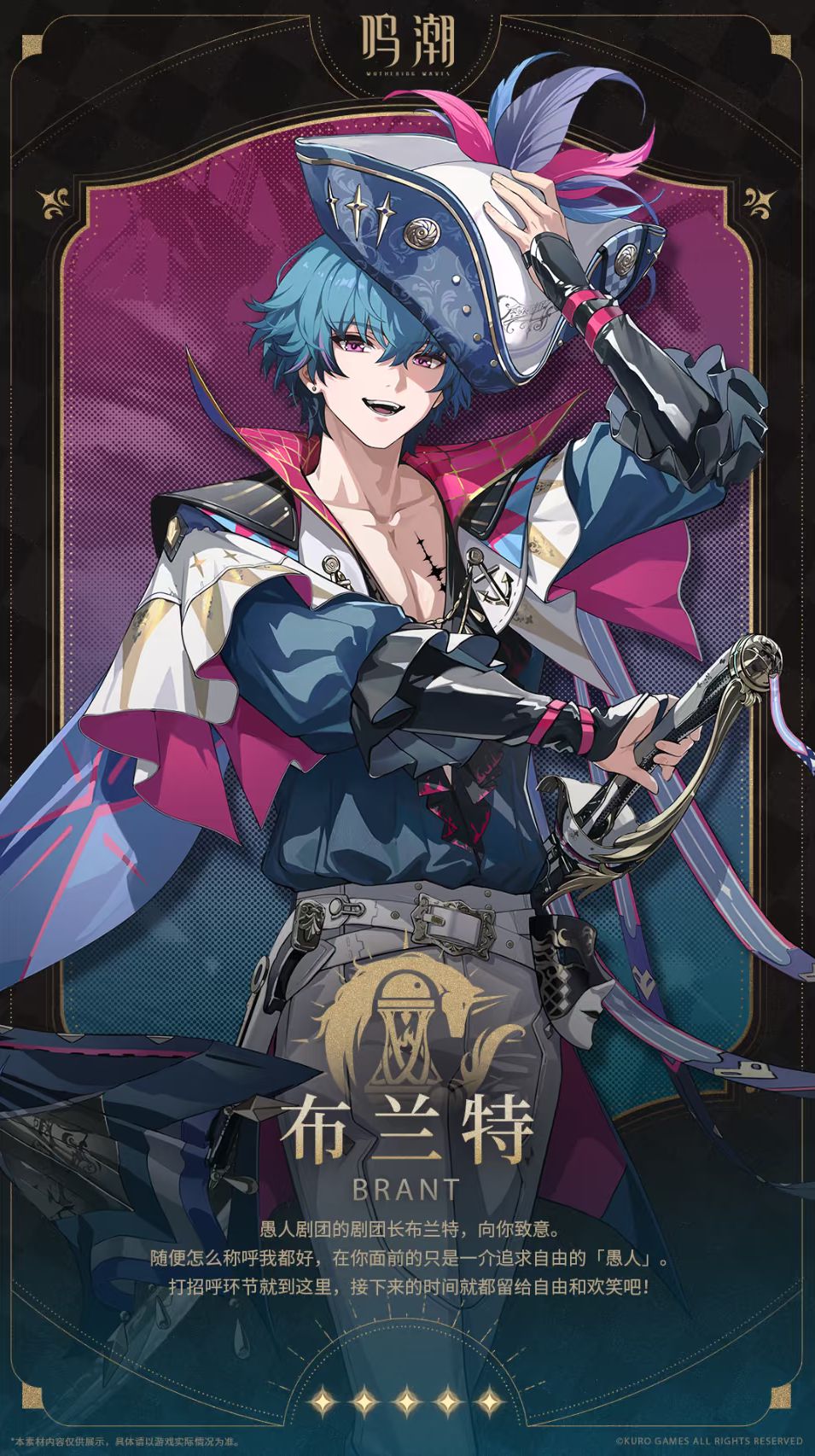 各位观众老爷们大家好期待已久的愚人剧团的团长也已经上线了!!不知道各位都抽到了没有!!有多少欧皇在活跃就有多少非酋在流泪!!!好了!下面进入正题,让我们来详细了解一下布兰特!!!