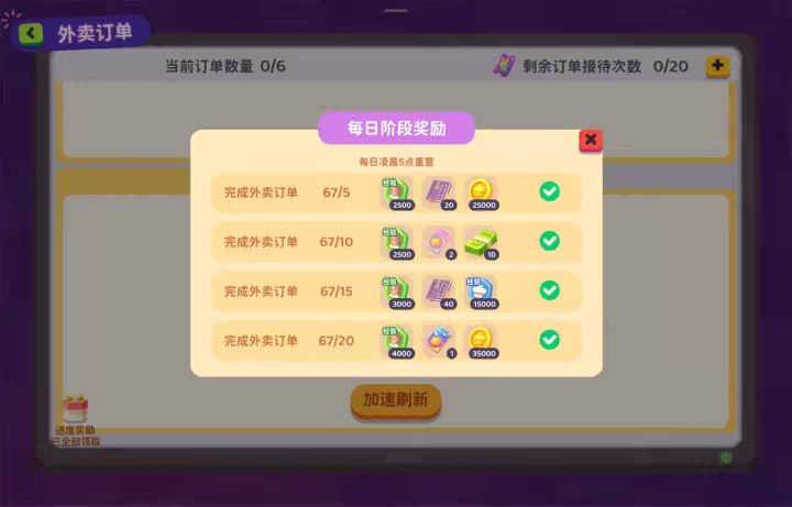 1.所有订单系统都增加了每日次数奖励(如图,不要忘记领取,奖励很丰富(外卖,私房菜,农场等),主要是外卖,很多人忘记领,会直接缺少经验卡级。