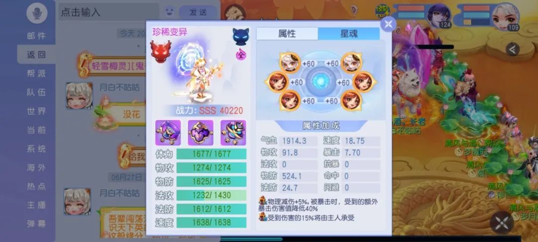 属性方面气血和物防为主,再加上一丢丢的速度,再强调一遍法攻是来源于1号位和二号位必带的,没办法!整体属性方面非常给力。
