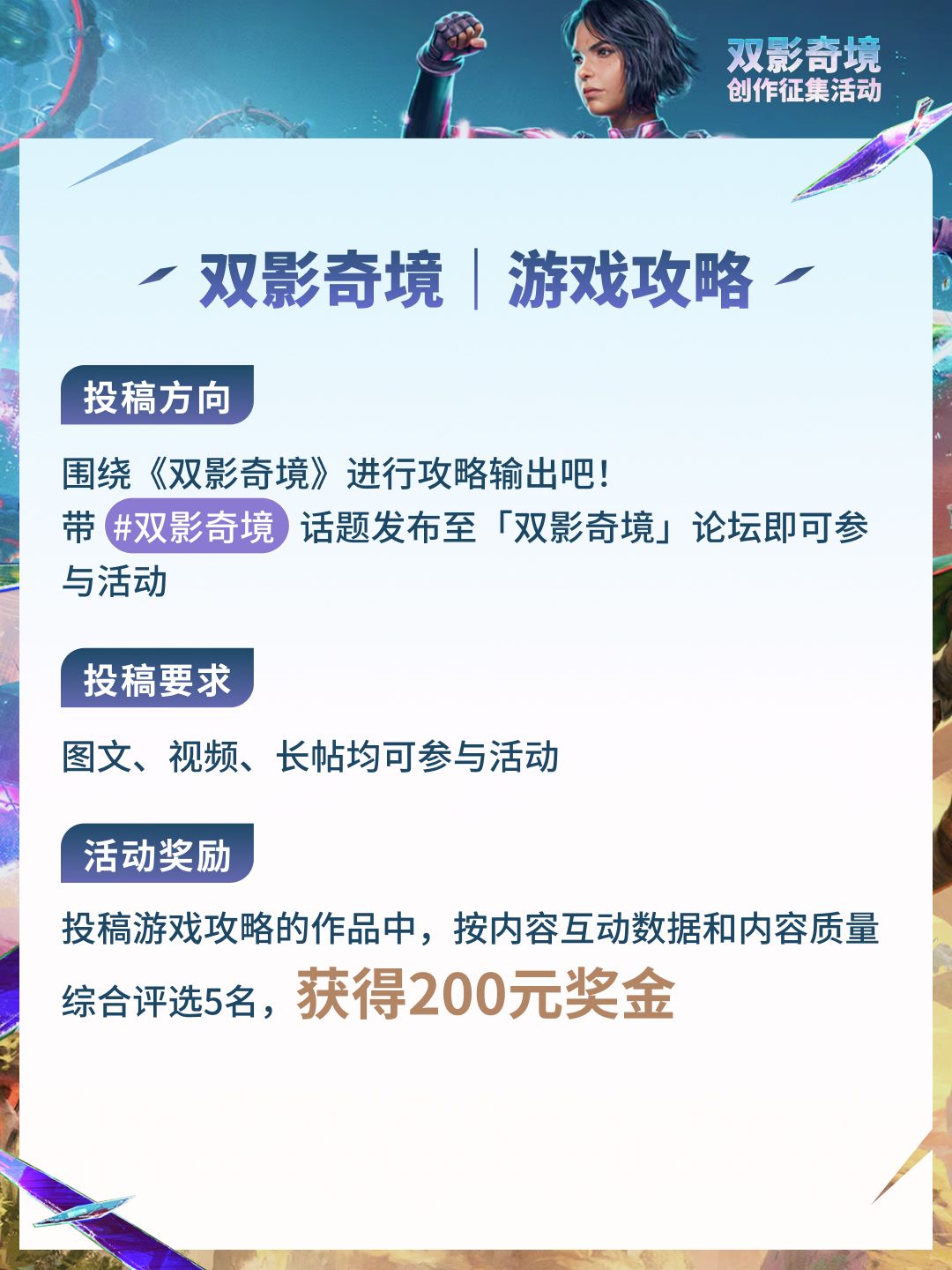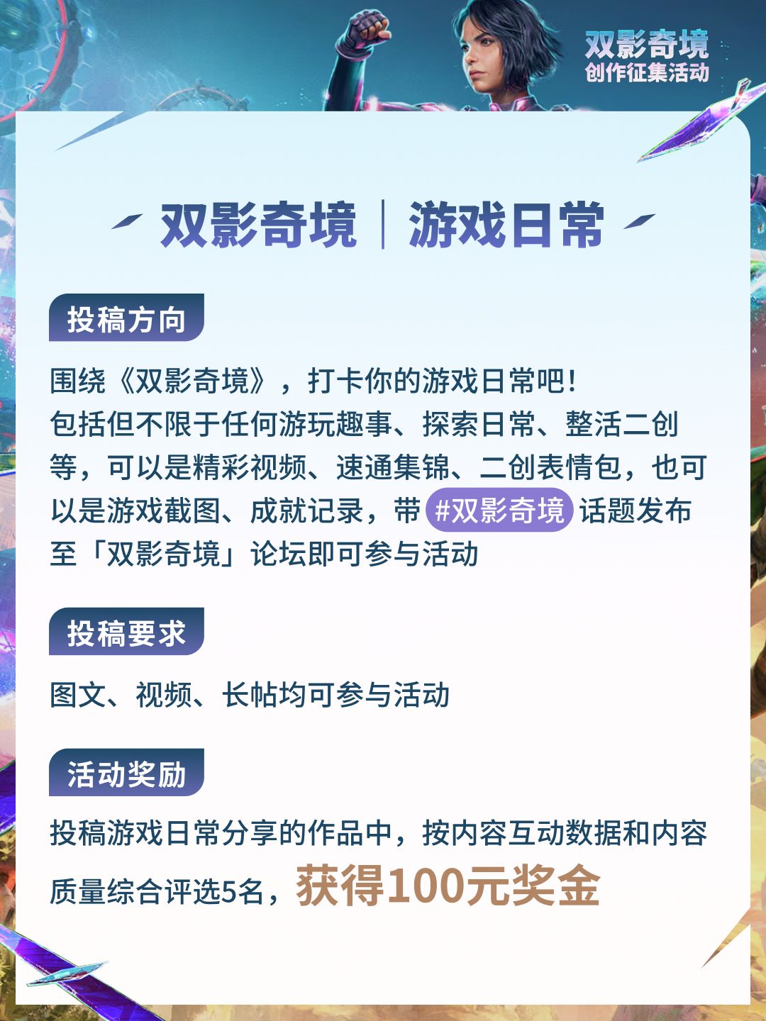 包括但不限于任何游玩趣事、探索日常、整活二创等,可以是精彩视频、速通集锦、二创表情包,也可以是游戏截图、成就记录,带#双影奇境 话题发布至「双影奇境」论坛即可参与活动