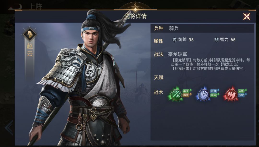 【战法】:豪龙破军:对敌方前3排部队发起龙骑冲锋,每击杀一个敌将,额外释放一次【翔龙回击】【翔龙回击】对敌方前5排部队造成大量伤害。