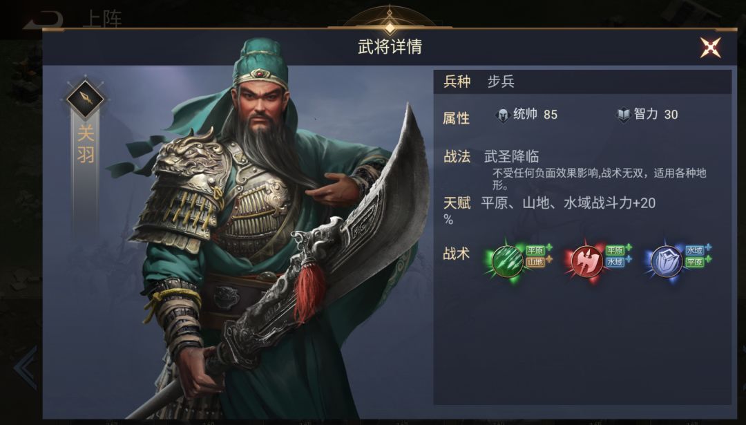 【战法】:武圣降临:不受任何负面效果影响,战术无双,适用各种地形。