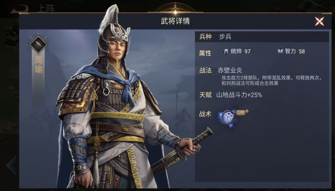 【战法】:赤壁业炎:攻击敌方2排部队,附带混乱效果,可释放两次,和刘邦战法可形成合击效果!