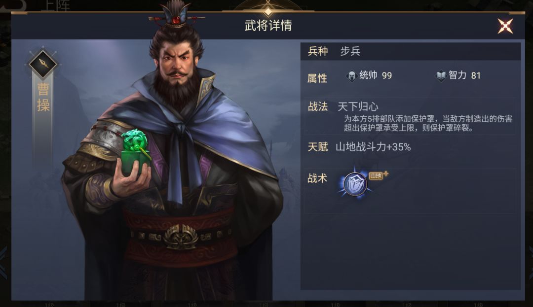 【战法】:天下归心:为本方5排部队添加保护罩,当敌方制造出的伤害超出保护罩承受上限时,则保护罩破裂!