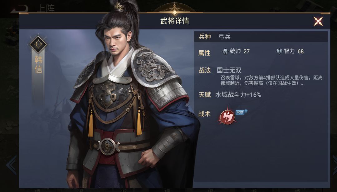 【战法】:国士无双:召唤雷球,对敌方前4排部队造成大量伤害,距离都城越近,伤害越高(仅在国战生效)。