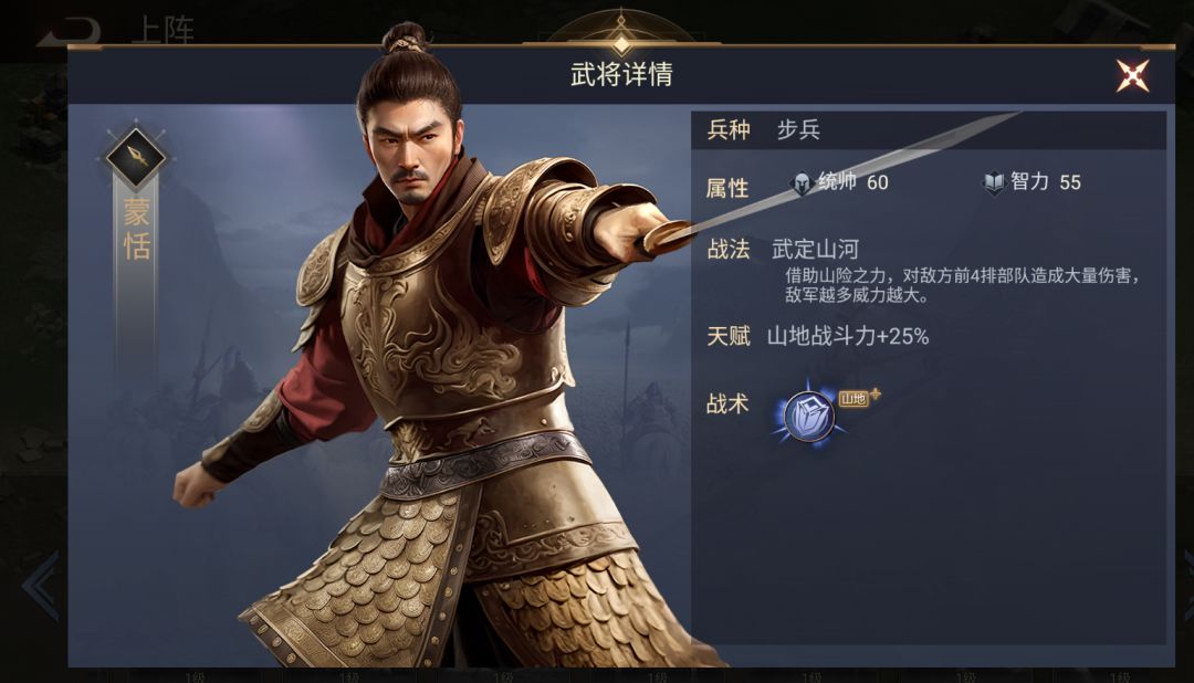 【战法】:武定山河:借助山险之力,对敌方前4排部队造成大量伤害,敌军越多威力越大。