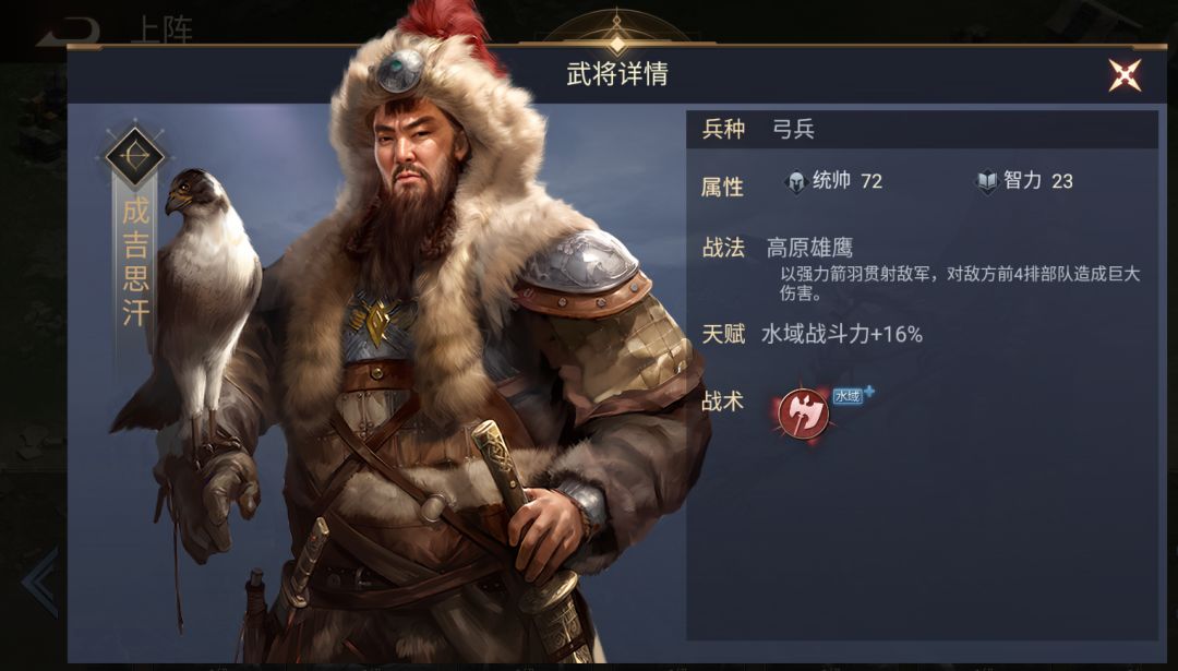 【战法】:高原雄鹰,以强力箭羽贯射帝君,对敌军前4排部队造成巨大伤害。