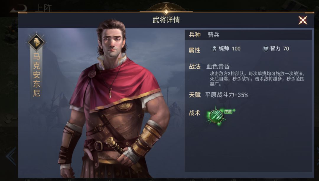 【战法】:血色黄昏——攻击敌方3排部队,每次单挑均可施放一次战法,死后自爆,秒杀敌军。击杀敌将越多,秒杀范围越广。