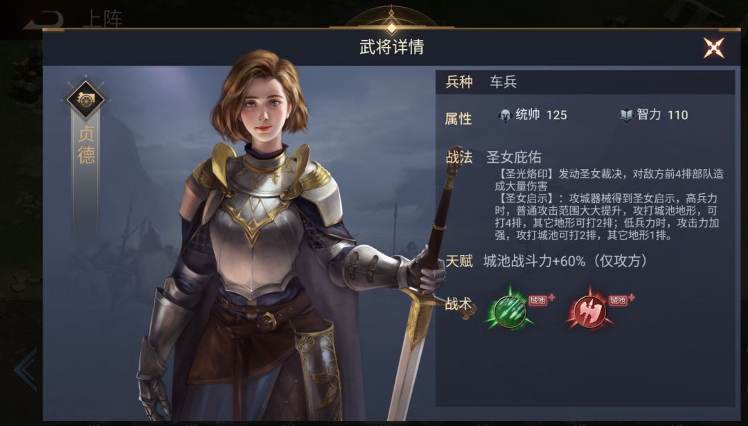 【战术】:奇袭城池加强版,城池可用,克制强攻,被坚守克制。强攻城池加强版,城池可用,克制坚守,被奇袭克制。