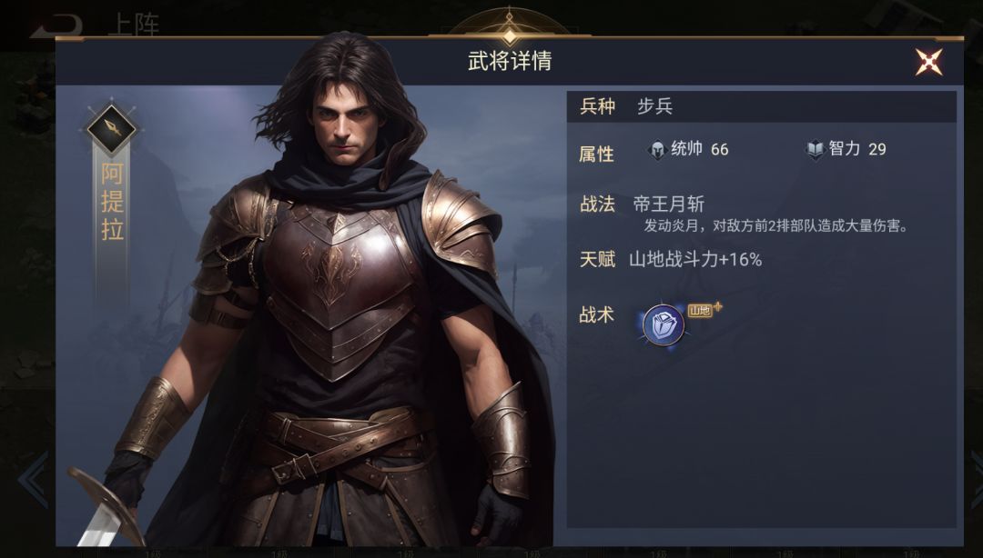 【天赋】:山地战斗力+16%