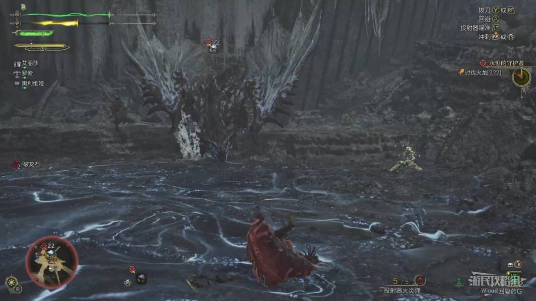 使用此招前,护火龙嘴里会明显露出火星子,还会有一个站立低头的前摇,前摇时间挺长,可以直接移动到头部侧面继续攻击。