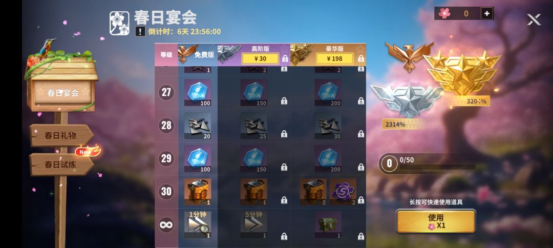 主要是通过使用花瓣解锁对应奖励,奖励分为免费版、高阶版和豪华版,其中高阶版和豪华版所需的氪金金额和奖励已经给大家整理出来了,大家根据自身需求决定是否解锁高阶奖励: