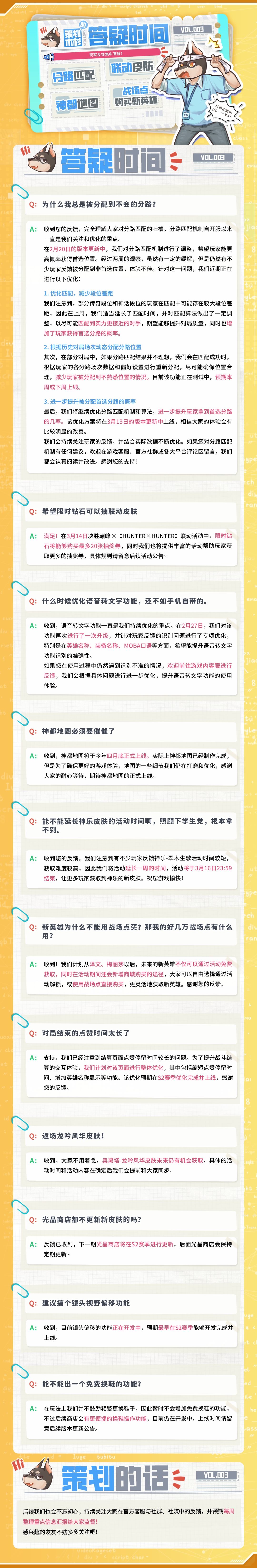 每个周五固定刷新的NPC——战斗策划木杉,准时出现!第3期答疑来啦~本期策划木杉针对分路匹配、神都地图、联动皮肤、英雄获取方式等近期友友们关心的问题进行了解答,快来和娜娜一起康康~