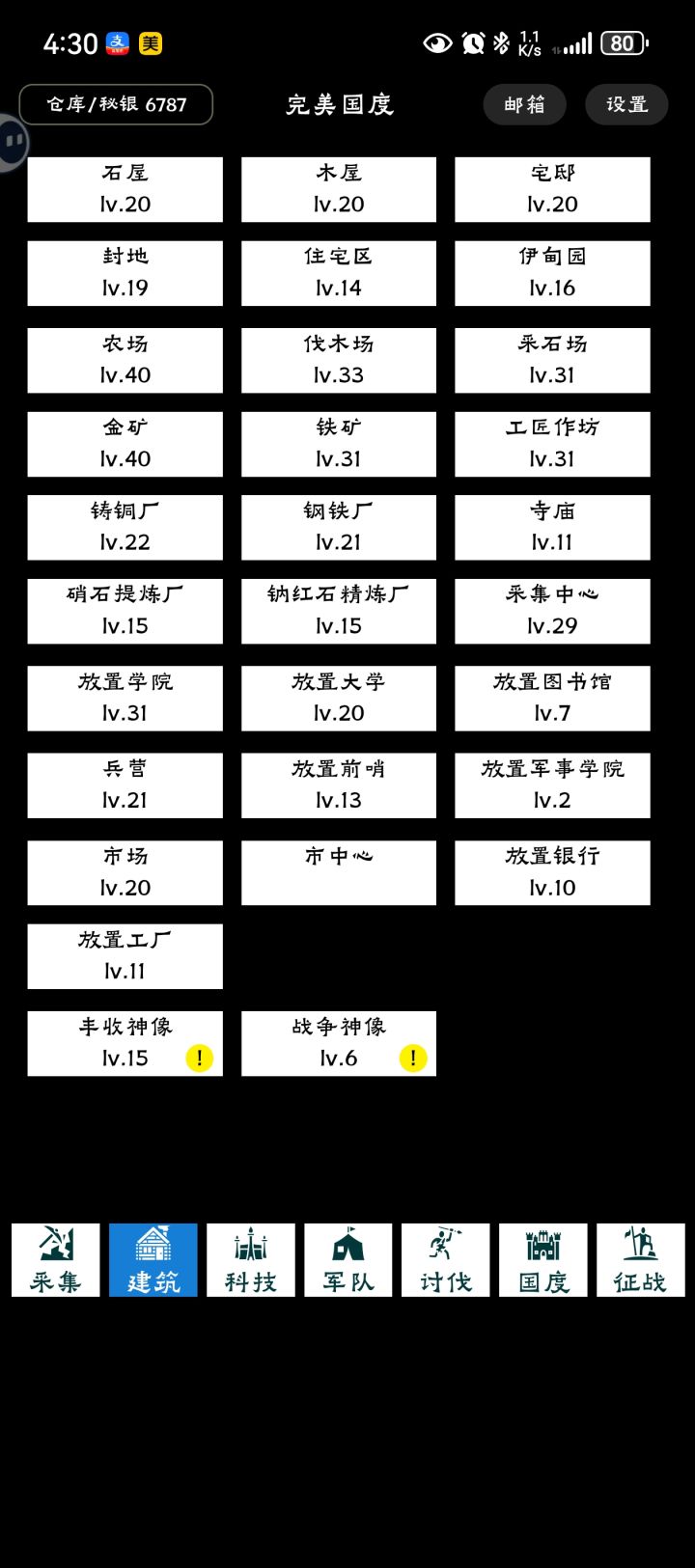 资源还是优先基建,农场、金矿、铁矿、工匠作坊、木材厂、采石场都点到31级,寺庙,纳红石点到11,钢、铜等都是11。