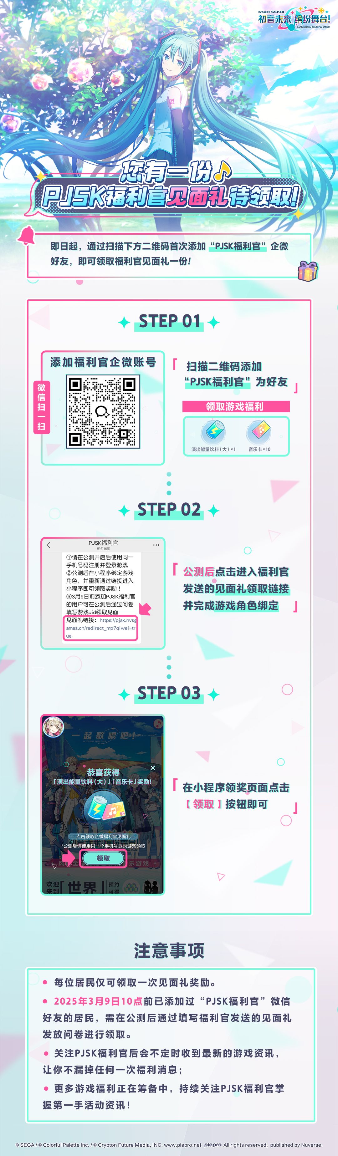 ✨2025年3月9日0点前已添加过“PJSK福利官”微信好友的居民,需在公测后通过填写福利官发送的见面礼发放问卷进行领取;