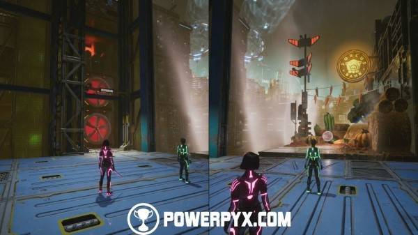 跟随主线任务推进,主线需要使用左侧升降梯才能继续前进,这里先不要上电梯,往右看可以看到这个支线任务气泡。在此支线任务中包含两个成就/奖杯【猪突猛进】、【吹呀吹呀吹】。