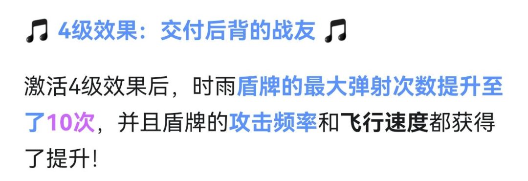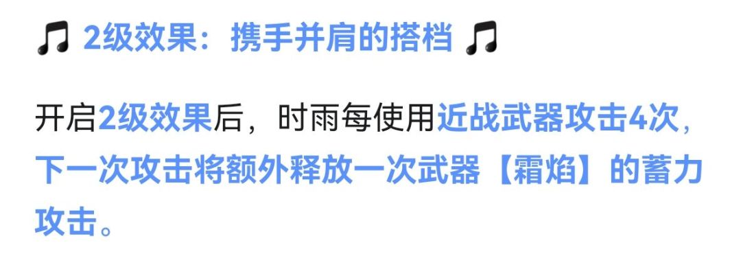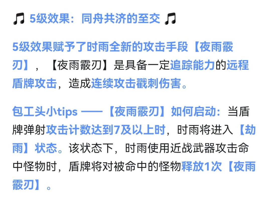 》其本身就是投掷一个盾牌,当盾牌连击次数达到7时,就需要时雨的蓄力攻击也就是霜焰来击打盾牌,让盾牌保持在7连击的最大值来达到最大收益,换而言之时雨不需要一直摁技能,只需要在盾牌消失后重新投掷盾牌即可。(时雨二模后的蓄力攻击与武器关系不大,只要是有近战副类别的武器都能触发时雨的蓄力攻击)