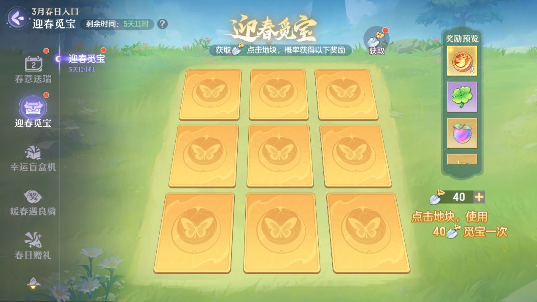 1、迎春觅宝踏青赏春,觅宝寻趣每日登录并达成一定活跃度,获取积分挖开地块,可得绑玉、抽奖币等道具!更有机会挖到幸运草获取双倍奖励!